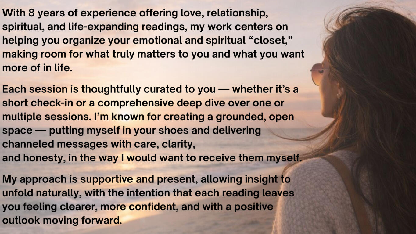 - Half-hour tarot reading focusing on 2 to 3 key questions.